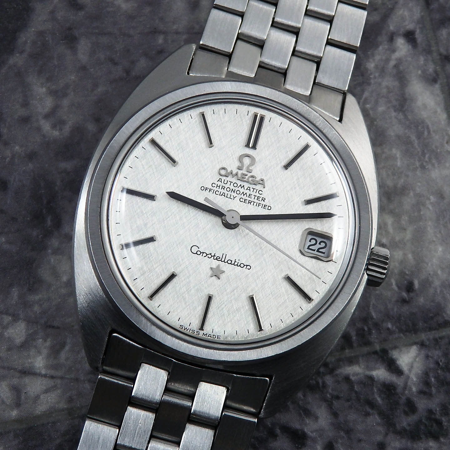 - 写真のオメガ 純正SSステンレス ブレスレットが付属し、超音波洗浄済みですので気持ちよくお使い頂けます。手首周りは最大約17.4cmになり、現状バックル部分のアジャスター穴で約15.7cmから最大約17.4cmの範囲で調節可能です。お好みに合わせて革ベルトに交換して頂きお使い頂く事も可能です。