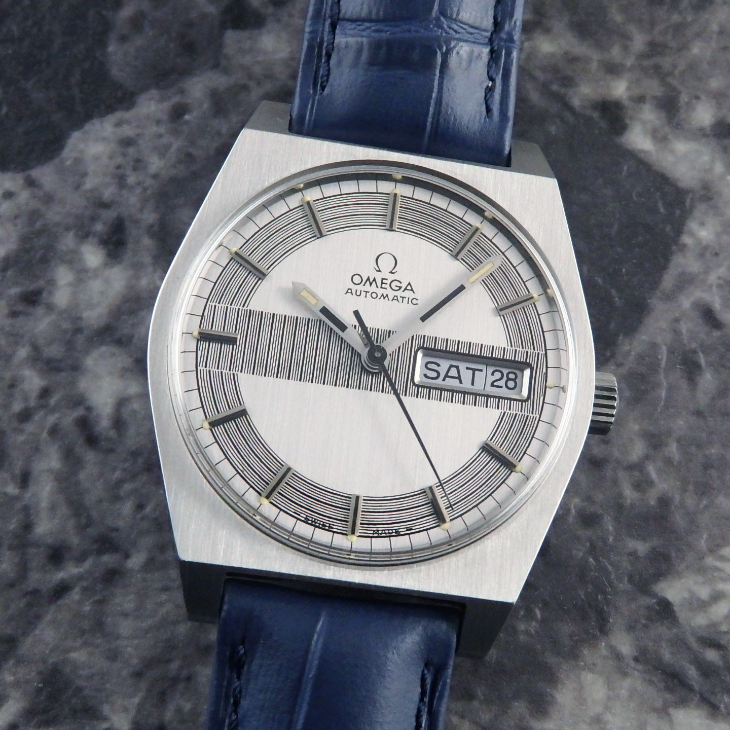 ダイヤル周りのベゼル部分は放射状のヘアラインが施され、ダイアルとハンドのバランスがよく、この腕時計にしか味わえない雰囲気で愛着がわきます。
