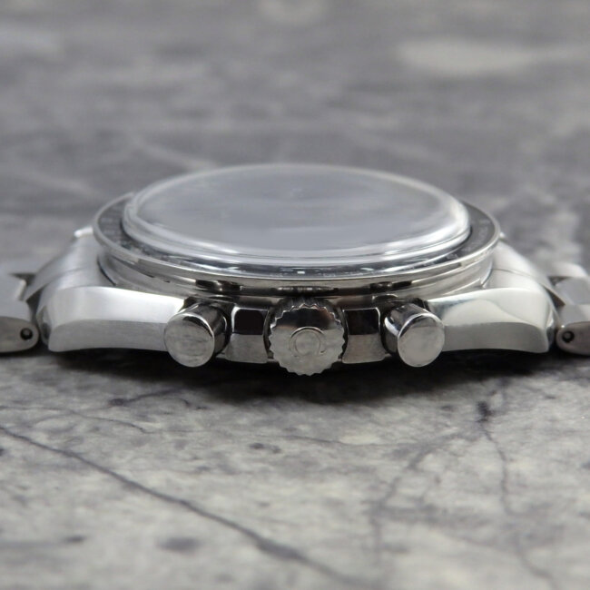 そしてブラックのベゼルにケースの美しいツイストラグ、伝統的なスピードマスターのムーンウォッチが放つ魅力ある雰囲気の美しいフォルムでΩマークの竜頭、Ω風防。