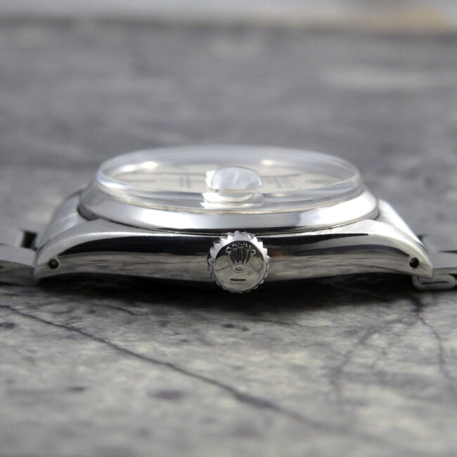 5振動でそのクオリティは歴代ロレックスの自動巻きモデルの中でも評判も良くメンテナンス的にも、そして耐久性も優れております。竜頭もロレックス王冠マーク入りです。