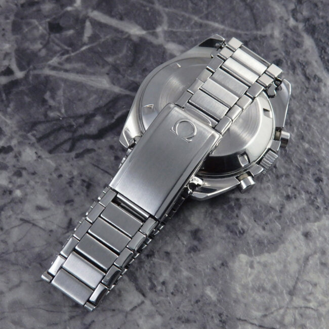 ドットオーバー90(90の数字の上にドット)も配されたタキメーターベゼルで、ブレスも大変希少なキャタピラブレスが付属し、格好よく魅力の詰まったスピードマスターの逸品。