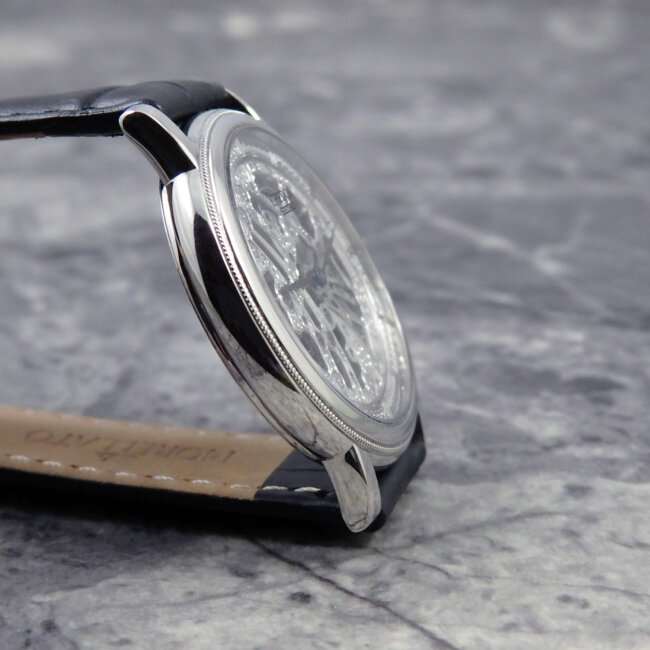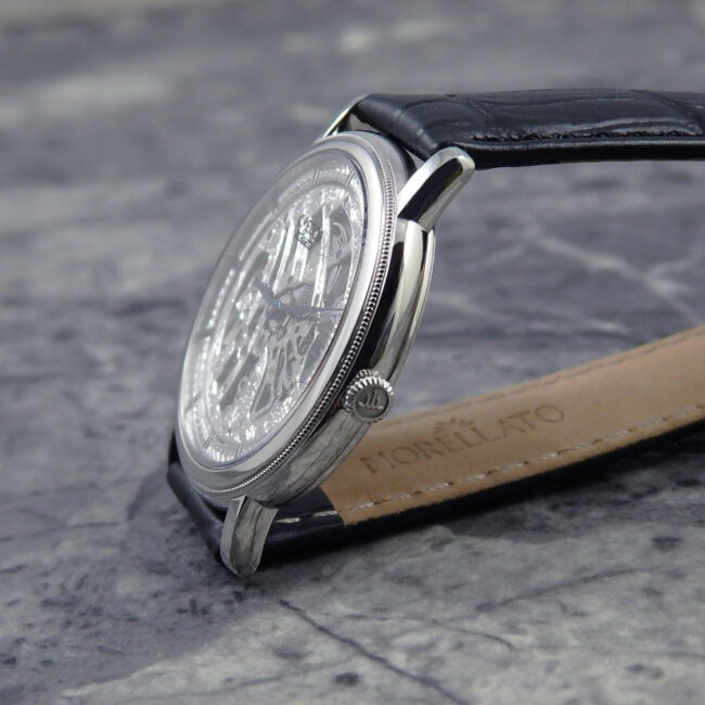 クレドールの中でも名品で両面スケルトンから除くムーブメントは厚さ1.98mmの極薄ムーブメントを搭載。