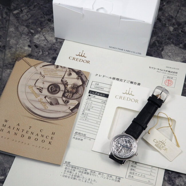- クレドール修理完了ご報告書(オーバーホール・外装仕上げ 2025年10月)、CREDOR SEIKO表記タグ、サービスボックス等、本体に写真の新品本革ベルト モレラート社製の、ブラックにCREDOR 純正尾錠(プラチナ)が付属致します。