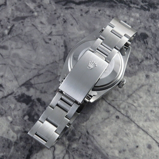 ロレックス純正SS三連ブレスレットが付属し、バックル部分のさりげない王冠マークも渋く、全体の一体感が御座います。