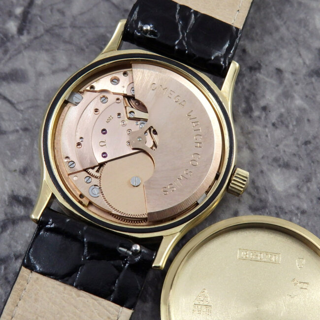 信頼性の高いオメガの繊細かつ緻密な美しい あかがね色の自動巻き式ムーブメントを搭載。オメガの自動巻きムーブメントの中でも全盛期時代を代表する緩急針微動調整装置付きの公認クロノメータームーブメントを搭載。