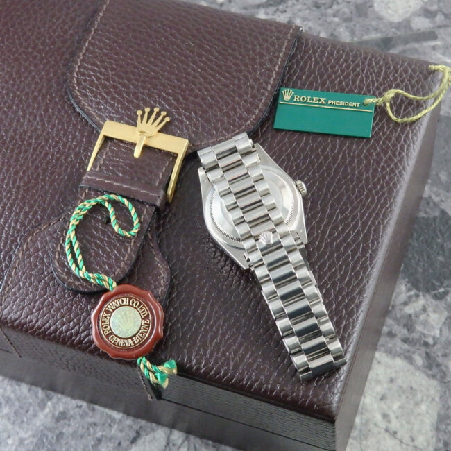 - 写真の貴重な販売当時の保証書ギャランティとロレックスのタグ(いずれも本体同様のシリアルナンバー)、貴重なロレックスのオリジナルハードボックス、写真のその他冊子、パスポートケース付属。ロレックス 18KWG プレジデントブレスレットが付属し、超音波洗浄済みですので気持ちよくお使い頂けます。手首周りは最大約19.3cmになり、それ以内は駒詰にて調節可能になります。お好みに合わせて革ベルトに交換して頂きお使い頂く事も可能です。