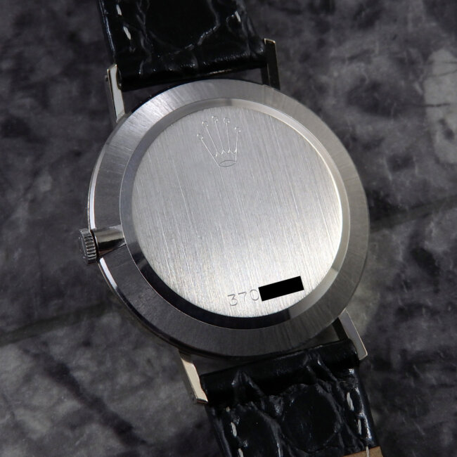 6時位置は希少な「σ SWISS σ」と表記された(σシグマ)マークが入り、WG ゴールドホワイトゴールド 金無垢素材のケースは文字盤との組み合わせも良くラウンドケースもより魅力を放ち、王冠マークの竜頭を装備。