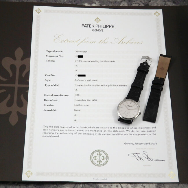 - 写真のスイス パテック・フィリップ(PATEK PHILIPPE)社のアーカイブ(メーカー正式書類1988年製造)が付属致します。写真の新品の本革ベルトのブラックに、貴重なPATEK PHILIPPEの純正バックルが付属致します。また本来から付帯しておりましたパテック・フィリップの純正クロコ革ベルト USEDも付属いたします。