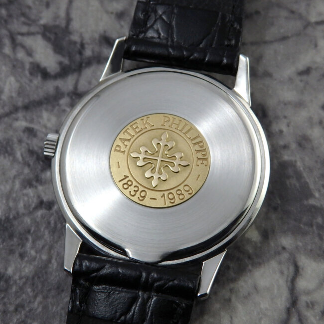 150周年記念を冠した希少モデルで裏蓋には-PATEK PHILIPPE-1839-1989のメダリオンが付いた特別なパテック フィリップのカラトラバ。