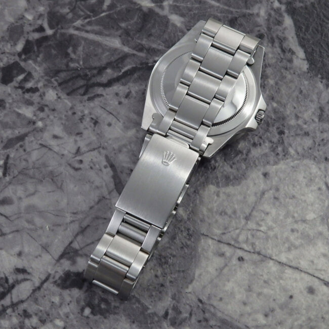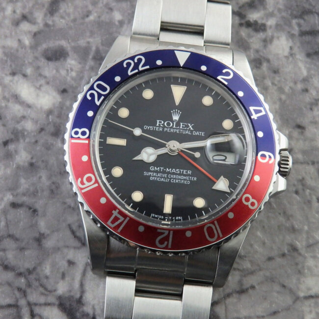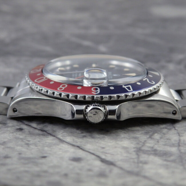 そのGMTマスターの歴代シリーズの中でも実用性もあり魅力あるヴィンテージの雰囲気をも持ち備えたGMT マスターといえる、この時代の人気の高いタイプ。