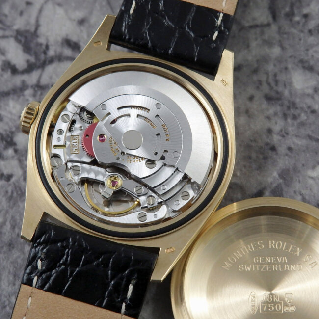 ロレックスの堅牢な王冠マークリューズが装着された金無垢素材のフルーテッドベゼル、金無垢オイスターケースのフォルムも何とも言えない高級感と風格が御座います。