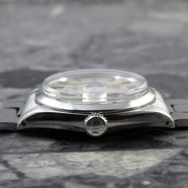 歴代ロレックスの自動巻きモデルの中でも評判も良い名機です。竜頭もロレックス王冠マーク入りです。