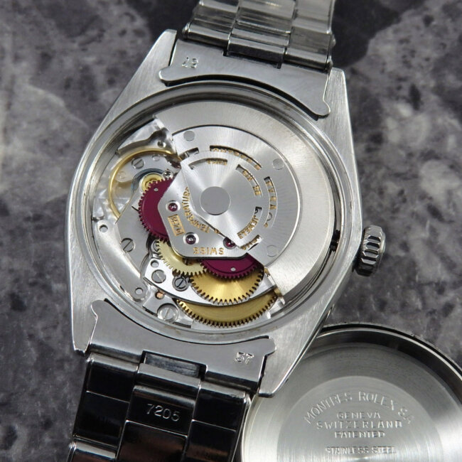 ムーブメントはロレックスの傑作ムーブメント名機1570。1520のクロノメーター仕様のマイクロステラ スクリューテンプ、19800回転/5.5振動数になります。