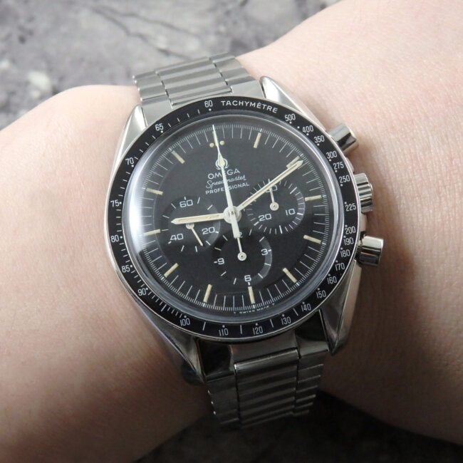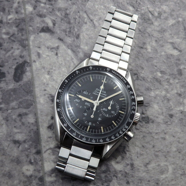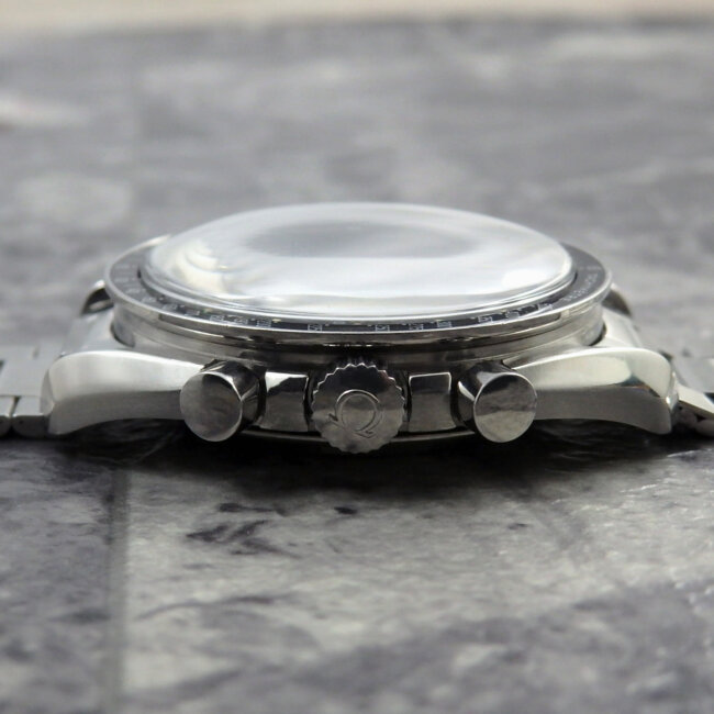 そしてブラックのベゼルにケースの美しいツイストラグ、この時代のスピードマスターのムーンウォッチが放つ魅力ある雰囲気の美しいフォルムでΩマークの竜頭、Ω風防。